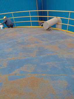 1月5日首先對(duì)1000T、500T罐頂部進(jìn)行除銹上漆。下圖:左邊第一道紅丹防銹漆,右邊為第二道孔雀蘭面漆后效果圖